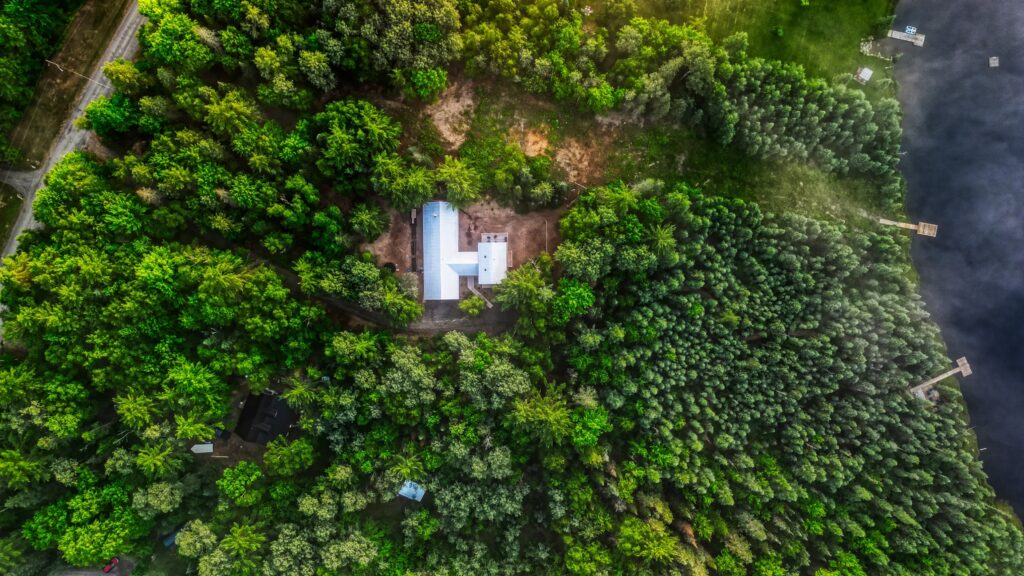 We have a few hiking trails winding their way through the forest and leading down to the lake. A 1 km trail that loops around the perimeter of our 3 acres is currently in the works.